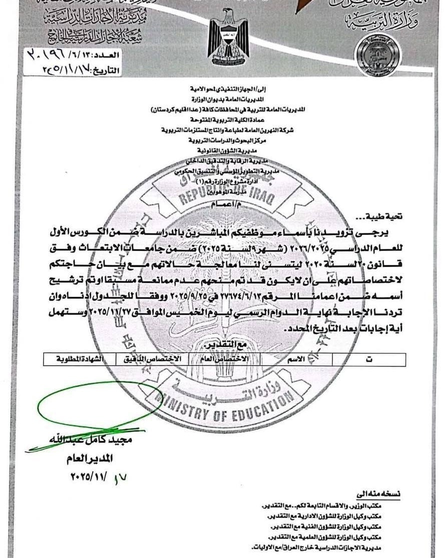 وأكملت الوزارة :”أن “الامتحانات ستجري داخل مراكز المحافظات حصراً وسيتم توزيع أسماء المتقدمين بين المراكز الامتحانية التي ستحدد لاحقاً”، مشيرة الى أنه “لا صحة لفتح مراكز امتحانية في الأقضية والنواحي والتقديم يتم حصراً عبر استمارة إلكترونية نشرت على الموقع الرسمي للوزارة”.