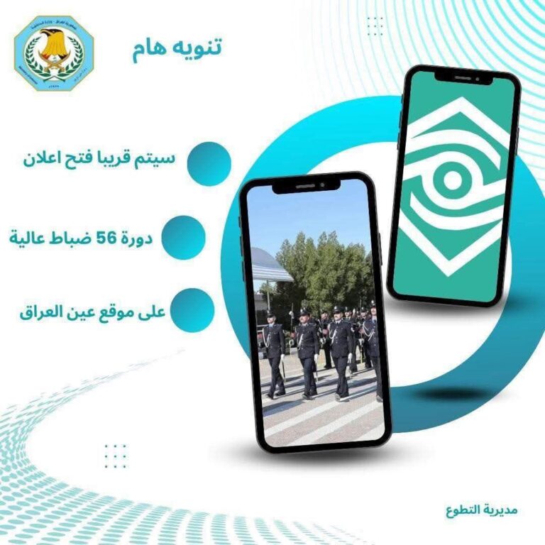 أعلنت وزارة الداخلية، اليوم الثلاثاء، عزمها فتح باب التقديم على الدورة (56) ضباط عالية للمفوضين من هم برتبة درجة رابعة فأعلى حملة الشهادة الإعدادية (او ما يعادلها) صعودا عبر تطبيق (عين العراق) خلال الأيام القليلة المقبلة.