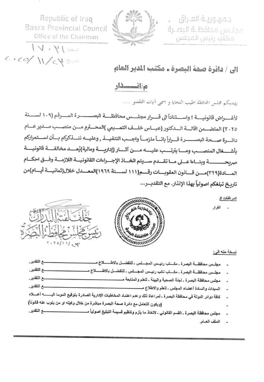 وجه مجلس محافظة البصرة إنذاراً رسمياً إلى مدير عام دائرة صحة البصرة، عباس خلف التميمي، بسبب استمراره في شغل المنصب بعد قرار إقالته.