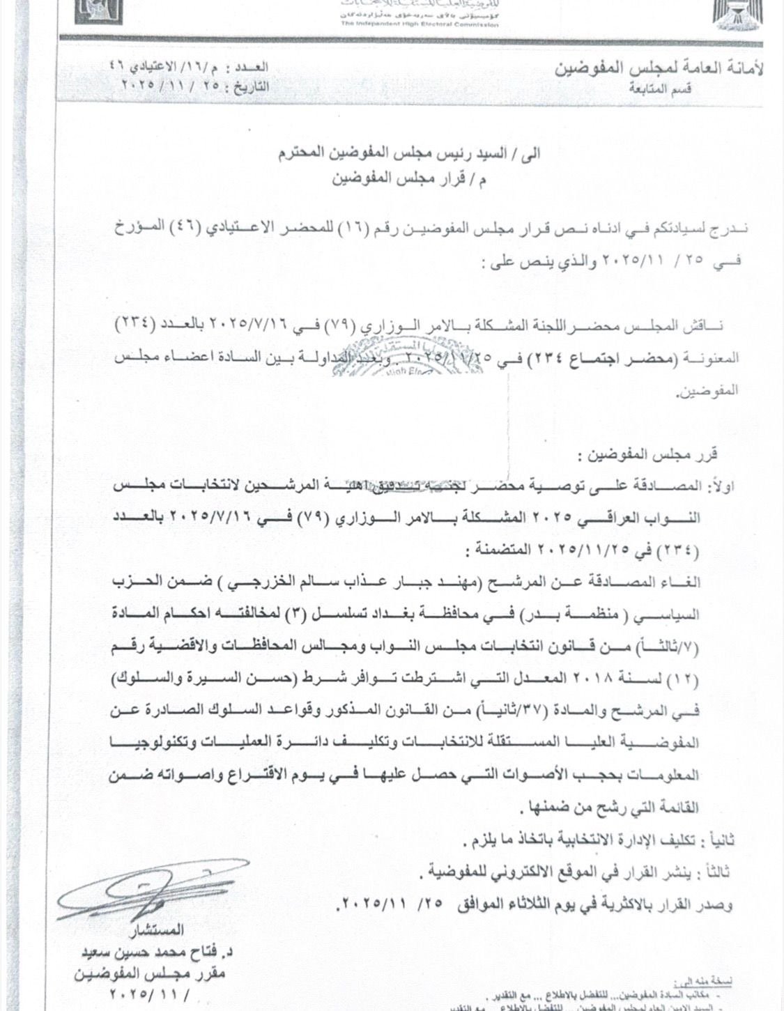 الغاء المصادقة عن المرشح (مهند جبار سالم الخزرجي ) ضمن الحزب السياسي (منظمة بدر) في محافظة بغداد تسلسل (3) لمخالفته احكام المادة (8/ثالثاً ) من قانون انتخابات مجلس النواب ومجالس المحافظات والاقضية رقم 12 لسنة 2018 المعدل التي اشترط توافر شرط (حسن السيرة والسلوك) في المرشح والمادة (37/ثانياً ) من القانون المذكور وقواعد السلوك عن المفوضية العليا للانتخابات وتكاليف دائرة العمليات والتكنولوجيا المعلومات بحجب الأصوات التي حصل عليها في يوم الاقتراع واصواته ضمن القائمة التي رشح من ضمنها”.