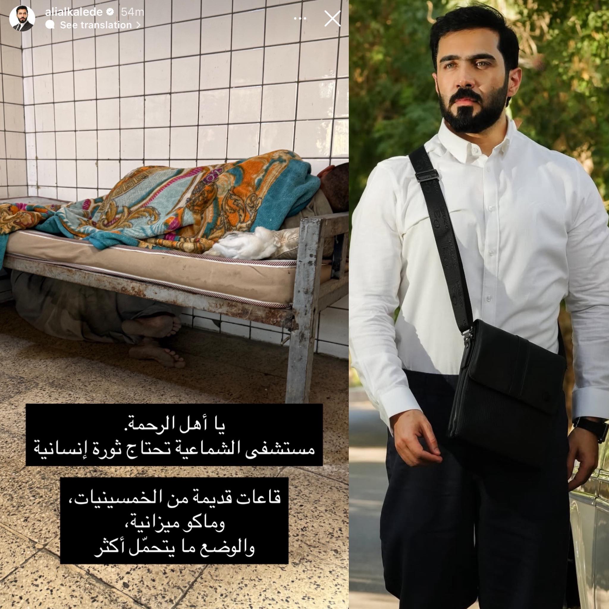 شاركها فيسبوك تويتر لينكدإن بينتيريست البريد الإلكتروني تداولت مواقع التواصل الاجتماعي تغريدة ( نسبت ) للإعلامي علي الخالدي ، حث فيها على مراعاة راقدي مستشفى الشماعية في بغداد . وقال الخالدي :”(يا أهل الرحمة مستشفى الشماعية تحتاج ثورة إنسانية )”.