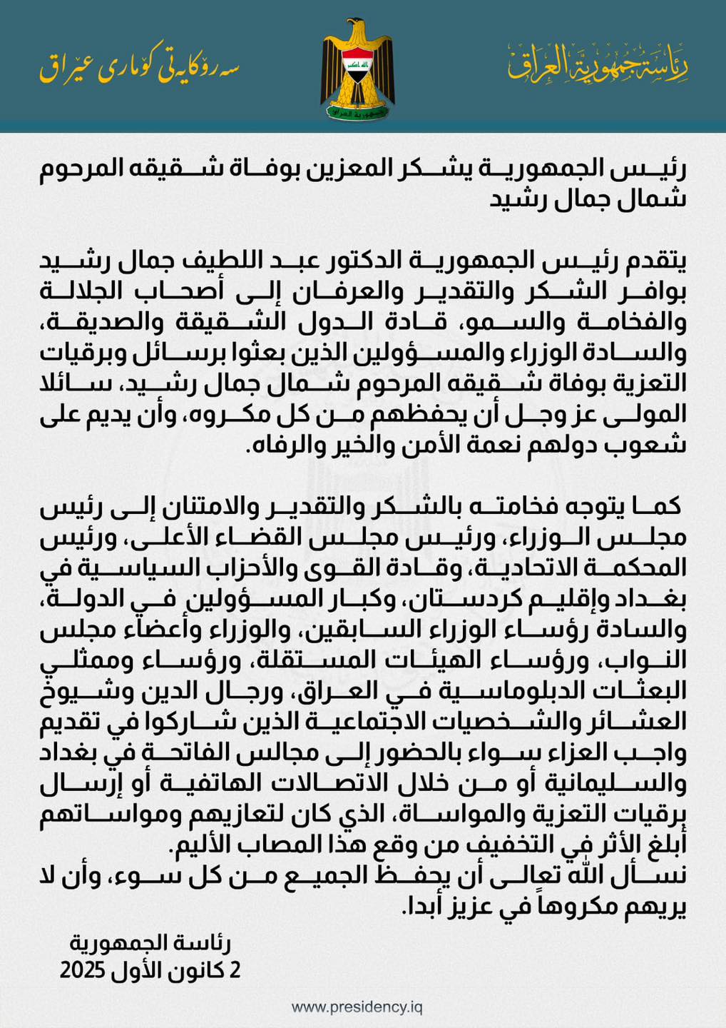تقدم رئيس الجمهورية الدكتور عبد اللطيف جمال رشيد بأحر التعازي والشكر إلى جميع الذين شاركوه الأحزان بوفاة شقيقه المرحوم شمال جمال رشيد.