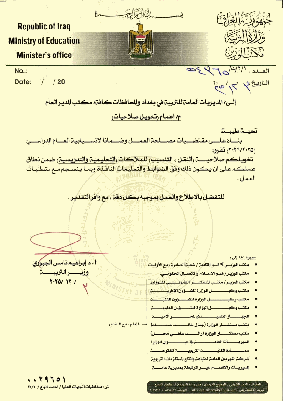 منح وزير التربية إبراهيم نامس الجبوري، اليوم الأربعاء، صلاحية النقل والتنسيب للملاكات التعليمية والتدريسية إلى المديرين العامين.