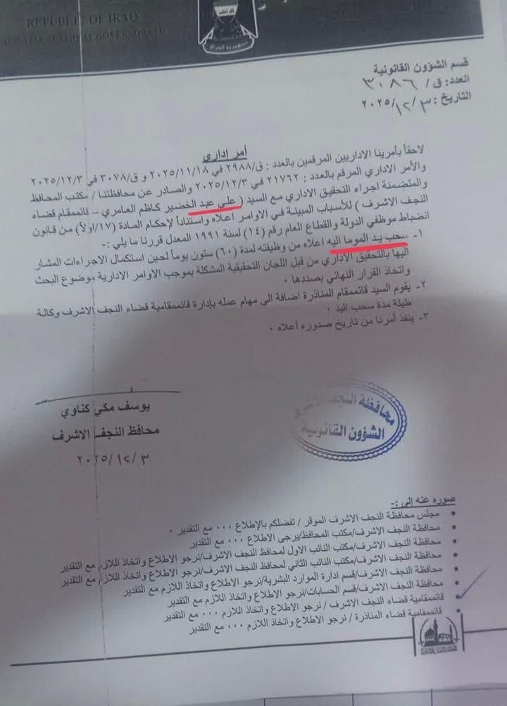 شاركها فيسبوك تويتر لينكدإن بينتيريست البريد الإلكتروني محافظ النجف يوسف كناوي يقرر سحب يد قائمقام قضاء النجف علي العامري لمدة 60 يومًا، لحين إكمال تحقيق إداري معه. وتكليف قائمقام المناذرة بإدارة قائمقامية النجف “وكالة” لحين انتهاء مدة سحب اليد.