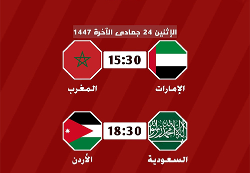 تختتم اليوم الاثنين، منافسات الدور ربع النهائي لبطولة كأس العرب “قطر 2025″، حيث حجزت منتخبات الأردن والسعودية والمغرب والإمارات مقاعدها في المربع الذهبي.