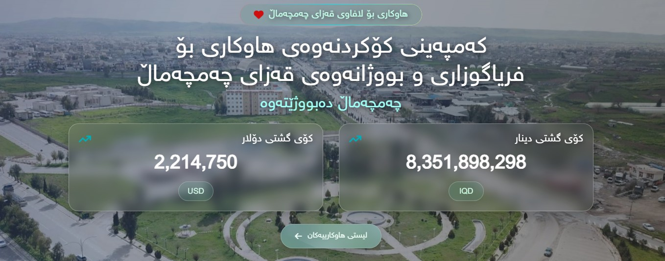 أعلنت لجنة الإغاثة وإعادة إعمار مدينة جمجمال ، اليوم الخميس، إطلاق موقع ” مساعدات كوردية ” المعني بتسجيل المساعدات المقدّمة للمتضررين من فيضان جمجمال، بالإضافة الى جميع بيانات المتبرعين والمواطنين.