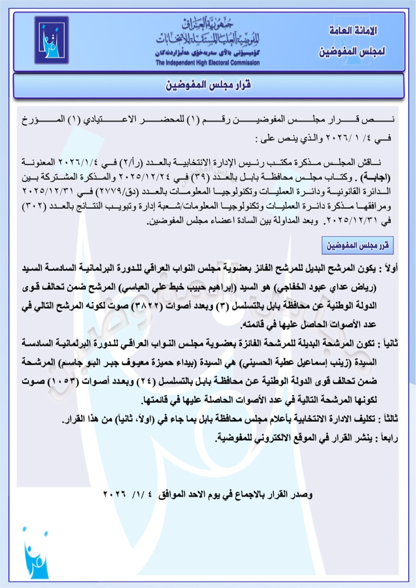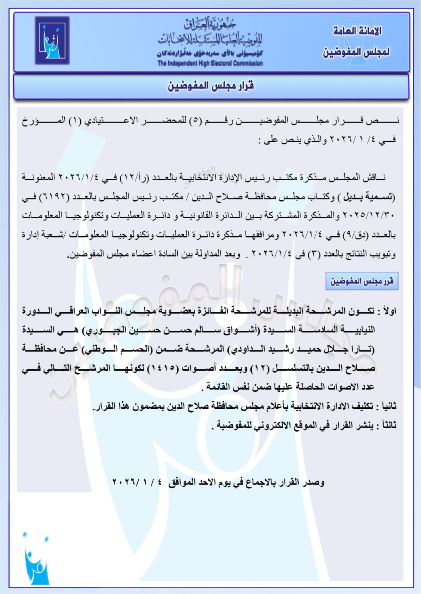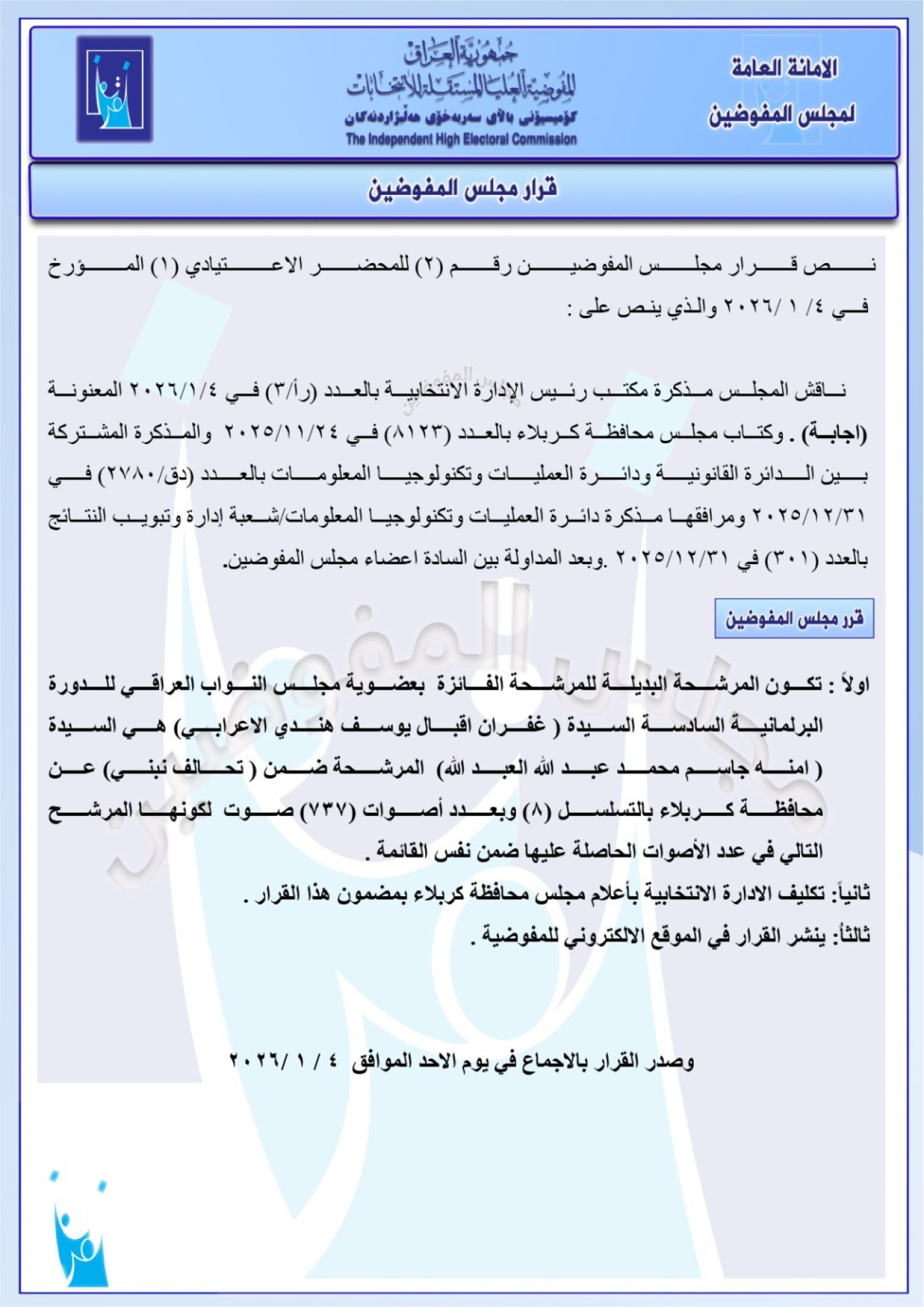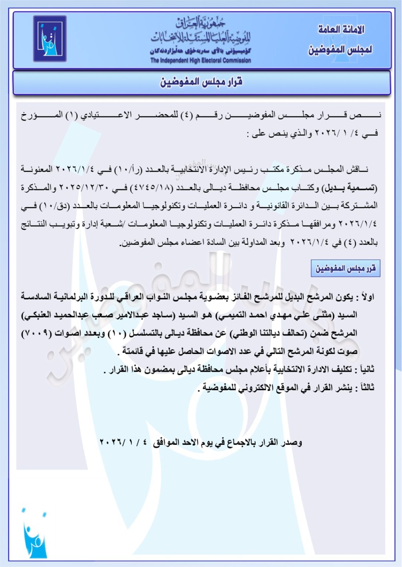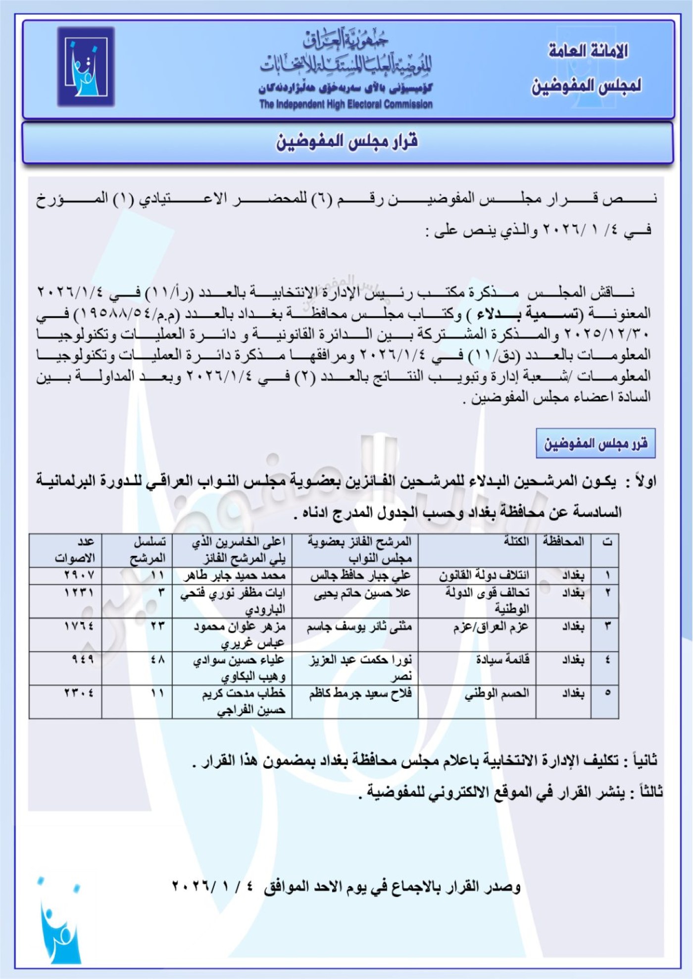 شاركها فيسبوك تويتر لينكدإن بينتيريست البريد الإلكتروني أعلنت المفوضية العليا المستقلة للانتخابات، اليوم الاثنين، عن مجموعة جديدة من البدلاء عن أعضاء مجلس النواب بدورته الحالية. وفيما يلي سلسلة من قرارات المفوضية: