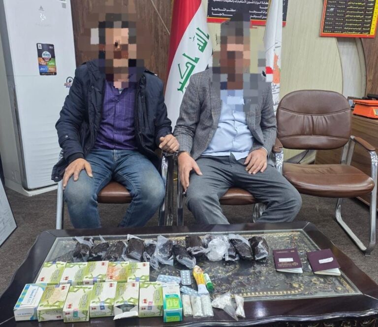 وقال القيسي في بيان إن “مديرية منفذ الشلامجة الحدودي، تمكنت من إلقاء القبض على مسافرين أجنبيين، ضُبطت بحوزتهما مادة الترياك المخدرة تزن (2.250) كغم، وحبوب مخدرة مختلفة الأحجام والأشكال والألوان عددها (1.750) حبة، مخبأة في حقيبة ملابسهما، في محاولة لتهريبها وإدخالها البلاد”.