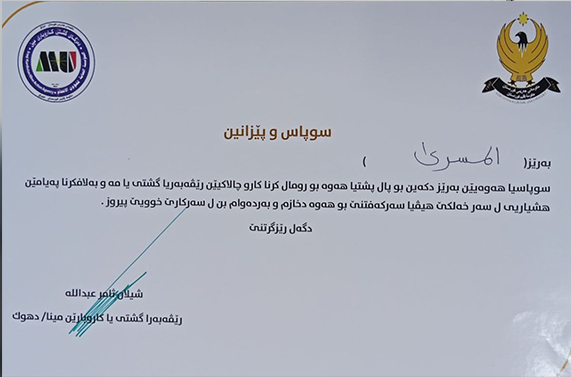 وثمنت رئيسة المؤسسة شيلان ثامر عبد الله في كتاب شكر بعثت به الى القناة عبر مراسلنا في بادينان بيار اميدي، دور القناة في تغطيتها واهتمامها المستمر بعمل المؤسسة ونقلها للارشادات التوعوية التي تنشرها للمواطنين، متمنية للقناة المزيد من النجاح والتألق.