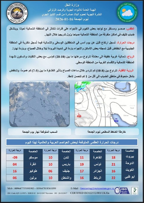 شاركها فيسبوك تويتر لينكدإن بينتيريست البريد الإلكتروني توقعت هيئة الأنواء الجوية، اليوم الجمعة، أن يكون الطقس صحواً ومستقراً مع بعض الغيوم، وتكوّن ضباب صباحي في مناطق شمالية يزول لاحقاً، فيما تسجل درجات الحرارة ارتفاعاً طفيفاً وسطاً وشمالاً وتكون مقاربة جنوباً، مع أجواء باردة.