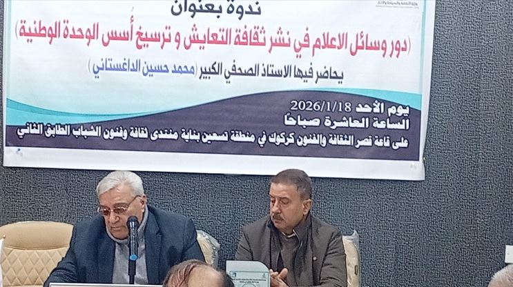 بحضور نخبة من المثقفين والصحفيين والإعلاميين والمهتمين بالشأن الثقافي والإعلامي، أُقيمت اليوم الأحد محاضرة فكرية في قصر الثقافة والفنون بكركوك، التابع لدائرة العلاقات الثقافية العامة في وزارة الثقافة والآثار والسياحة العراقية، ألقاها الكاتب والصحفي محمد حسين الداغستاني الرئيس الاسبق لنقابة الصحفیین العراقیین فرع كركوك ، بعنوان (دور وسائل الإعلام في نشر ثقافة التعايش وترسيخ أسس الوحدة الوطنية).