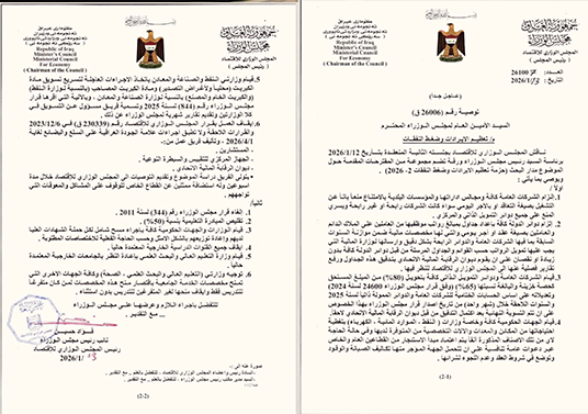 كما أوصى المجلس بقيام وزارتي النفط والصناعة والمعادن باتخاذ الإجراءات العاجلة لتسريع تسويق مادة الكبريت محلياً ولأغراض التصدير، وإيقاف العمل بتطبيق إجراءات علامة الجودة العراقية على السلع والبضائع لغاية 1 نيسان 2026.
