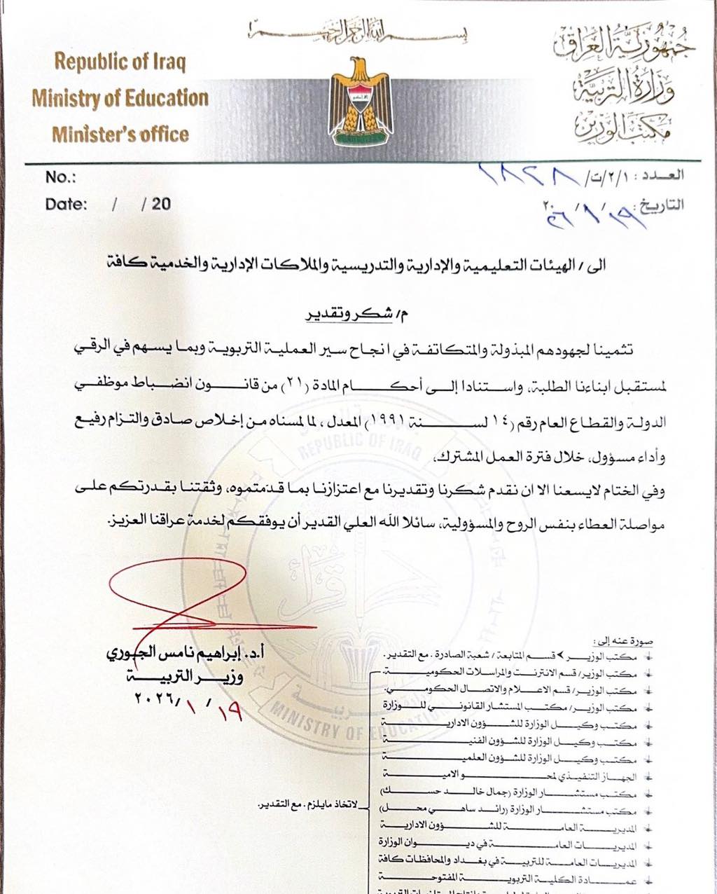 شاركها فيسبوك تويتر لينكدإن بينتيريست البريد الإلكتروني وجه وزير التربية الاتحادية الإثنين 19 , كانون الثاني 2026 كتاب شكر لجميع الهيئات التعليمية والتدريسية والإدارية والملاكات الخدمية كافّة في ضوء الزامهم بأداء المهام المنوطة بهم خلال فترة عملهم المشترك.