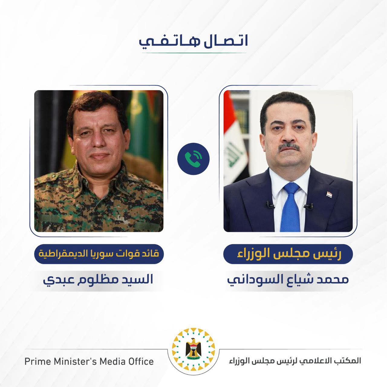 أجرى رئيس مجلس الوزراء محمد شياع السوداني، مساء اليوم الثلاثاء، اتصالاً هاتفياً من قائد قوات سوريا الديمقراطية مظلوم عبدي.