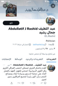 وقال مكتبه الإعلامي أن مكتب فخامة رئيس الجمهورية الدكتور عبداللطيف جمال رشيد يعلن ان حسابه الرسمي على منصة تويتر هو @LJRashid مؤكدا عدم صلته بأية حسابات اخرى.