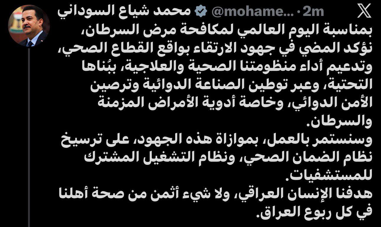 وقال رئيس الوزراء في تدوينة على منصة (X)،تابعه المسرى ، إنه “بمناسبة اليوم العالمي لمكافحة مرض السرطان، نؤكد المضي في جهود الارتقاء بواقع القطاع الصحي، وتدعيم أداء منظومتنا الصحية والعلاجية، ببُناها التحتية، وعبر توطين الصناعة الدوائية وترصين الأمن الدوائي، وخاصة أدوية الأمراض المزمنة والسرطان”.