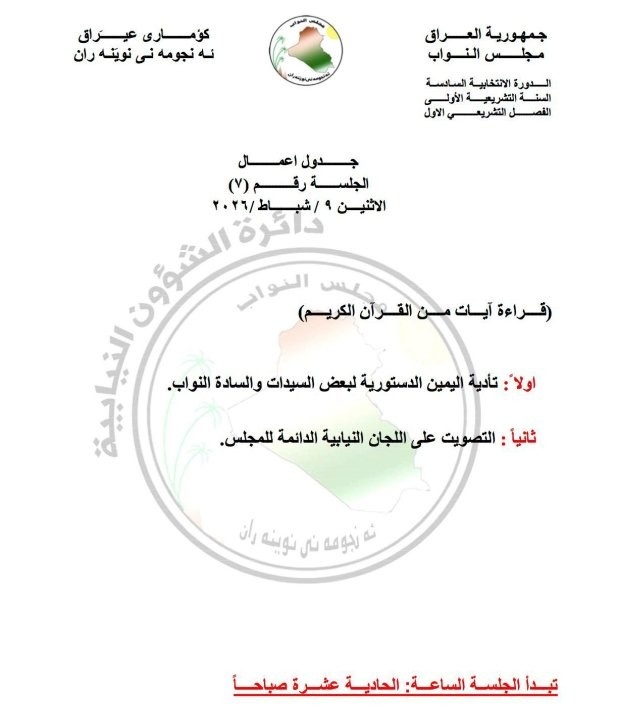 نشر مجلس النواب، جدول أعمال جلسته ليوم الإثنين المقبل. وبحسب الدائرة الإعلامية للبرلمان فقد تضمن جدول أعمال الجلسة تأدية اليمين الدستورية لبعض أعضاء مجلس النواب، بالإضافة الى التصويت على اللجان النيابية الدائمة للمجلس.