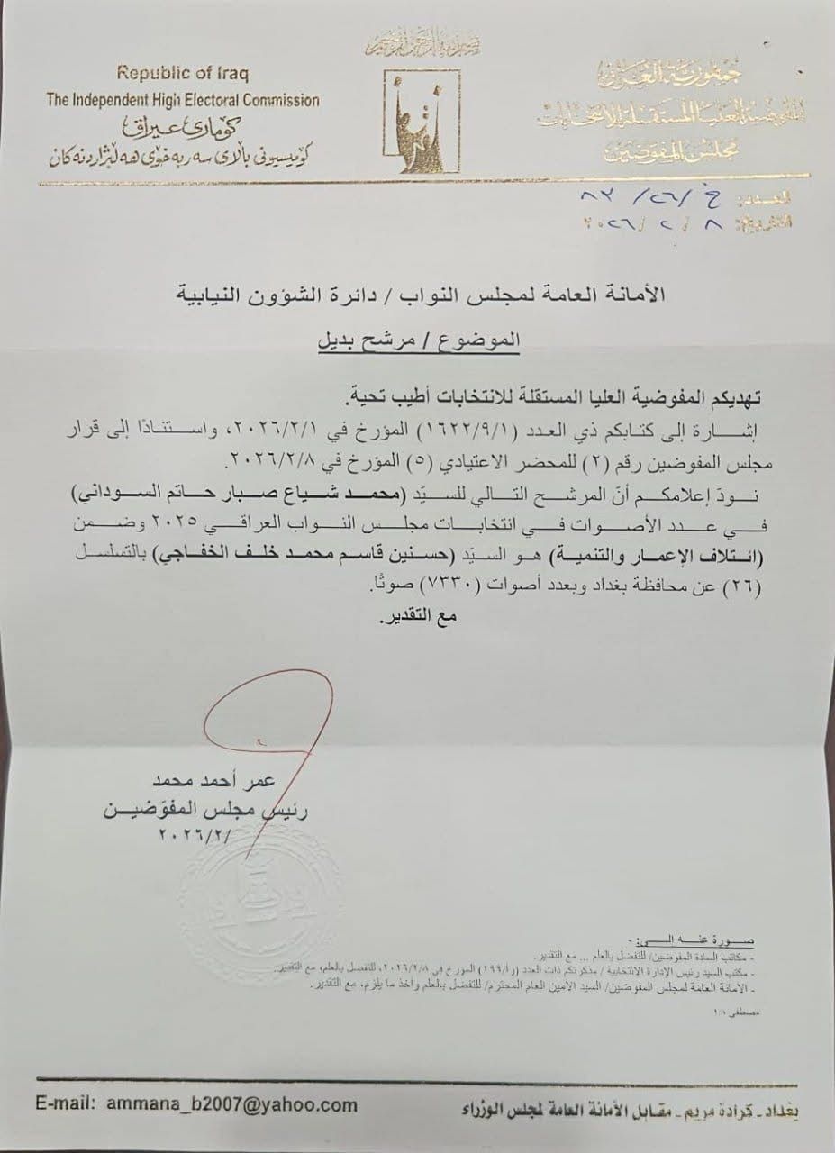 وأشارت وثيقة صادرة عن المفوضية، إلى أنها وجهت كتاباً إلى الأمانة العامة لمجلس النواب/دائرة الشؤون النيابية، تُبلغ فيه بأن المرشح التالي لرئيس مجلس الوزراء (محمد شياع صبار حاتم السوداني) في عدد الأصوات في انتخابات مجلس النواب 2025 وضمن (ائتلاف الإعمار والتنمية) هو (حسنين قاسم محمد خلف الخفاجي) بالتسلسل (26) عن محافظة بغداد وبعدد أصوات بلغ (7330) صوتاً”.