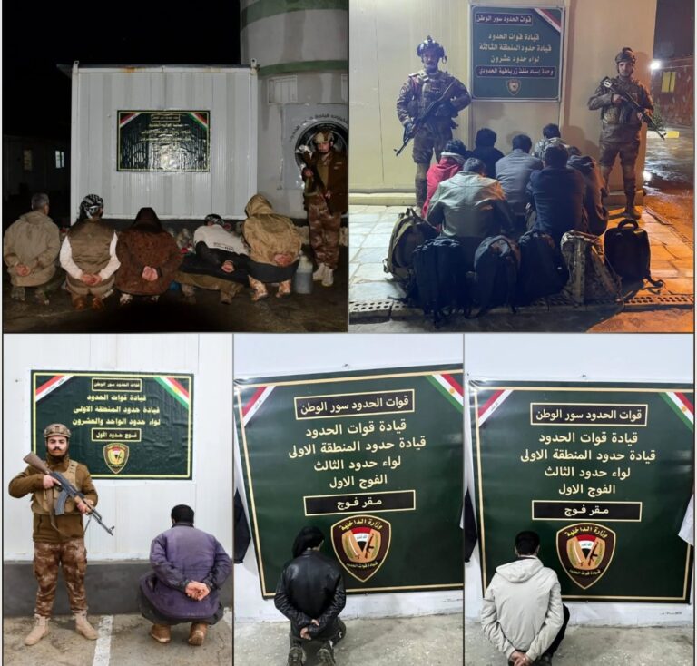 وأكدت قيادة قوات الحدود أنه “تم تنظيم محاضر ضبط أصولية بحق الموقوفين، واتخاذ الإجراءات القانونية اللازمة”، مشيرة إلى أن “هذه العمليات تأتي في إطار مهامها المستمرة للتصدي لحالات التسلل والتهريب وحماية الحدود العراقية”.