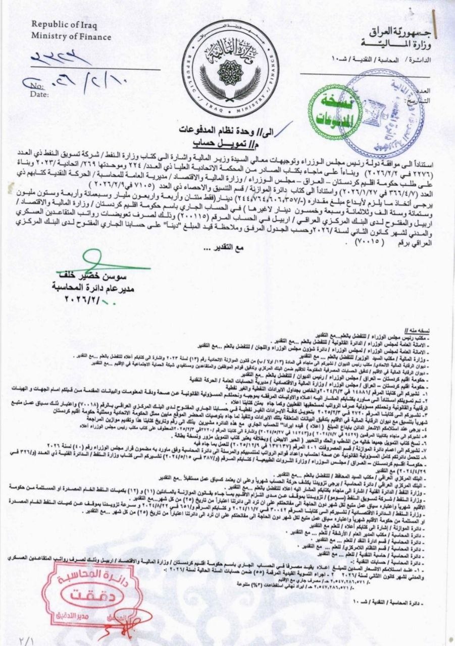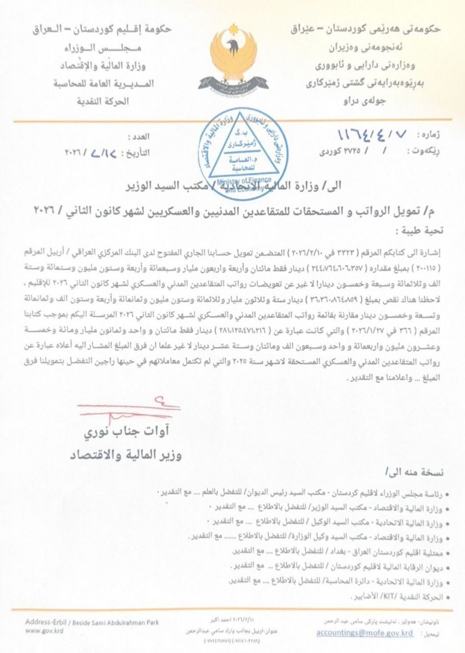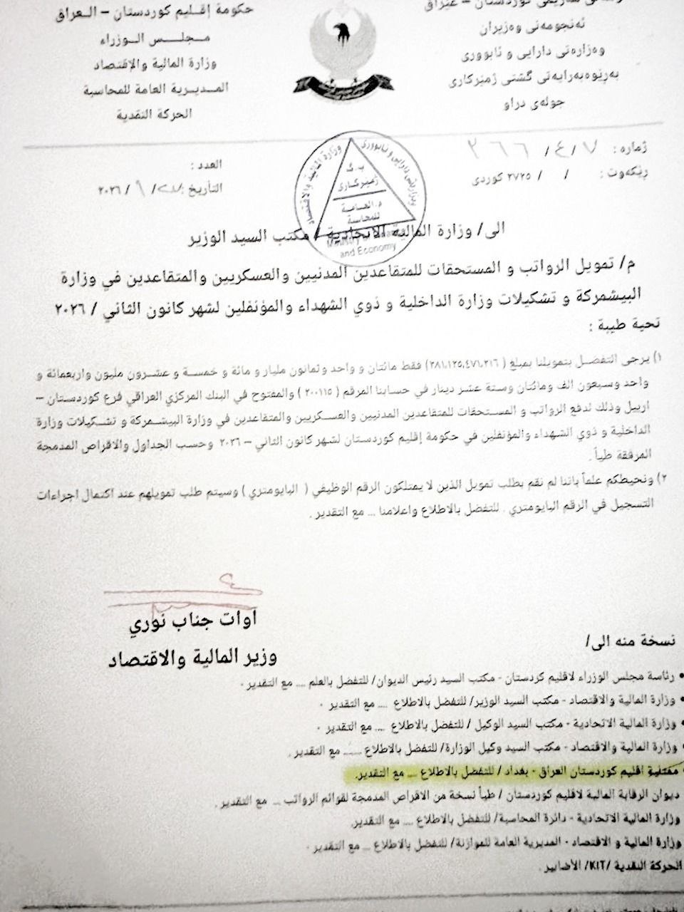 أكدت وزارة المالية والاقتصاد في إقليم كردستان، اليوم الخميس، أن المسؤولية القانونية لصرف رواتب موظفي الإقليم تقع على وزارة المالية الاتحادية، مشيرةً إلى أن الرواتب تُصرف منذ ثلاث سنوات من بغداد بشكل كامل وفق قوانين الموازنة الاتحادية للأعوام 2023 و2024 و2025، وأن أي نقص أو استقطاع يقع على عاتق الوزارة الاتحادية.