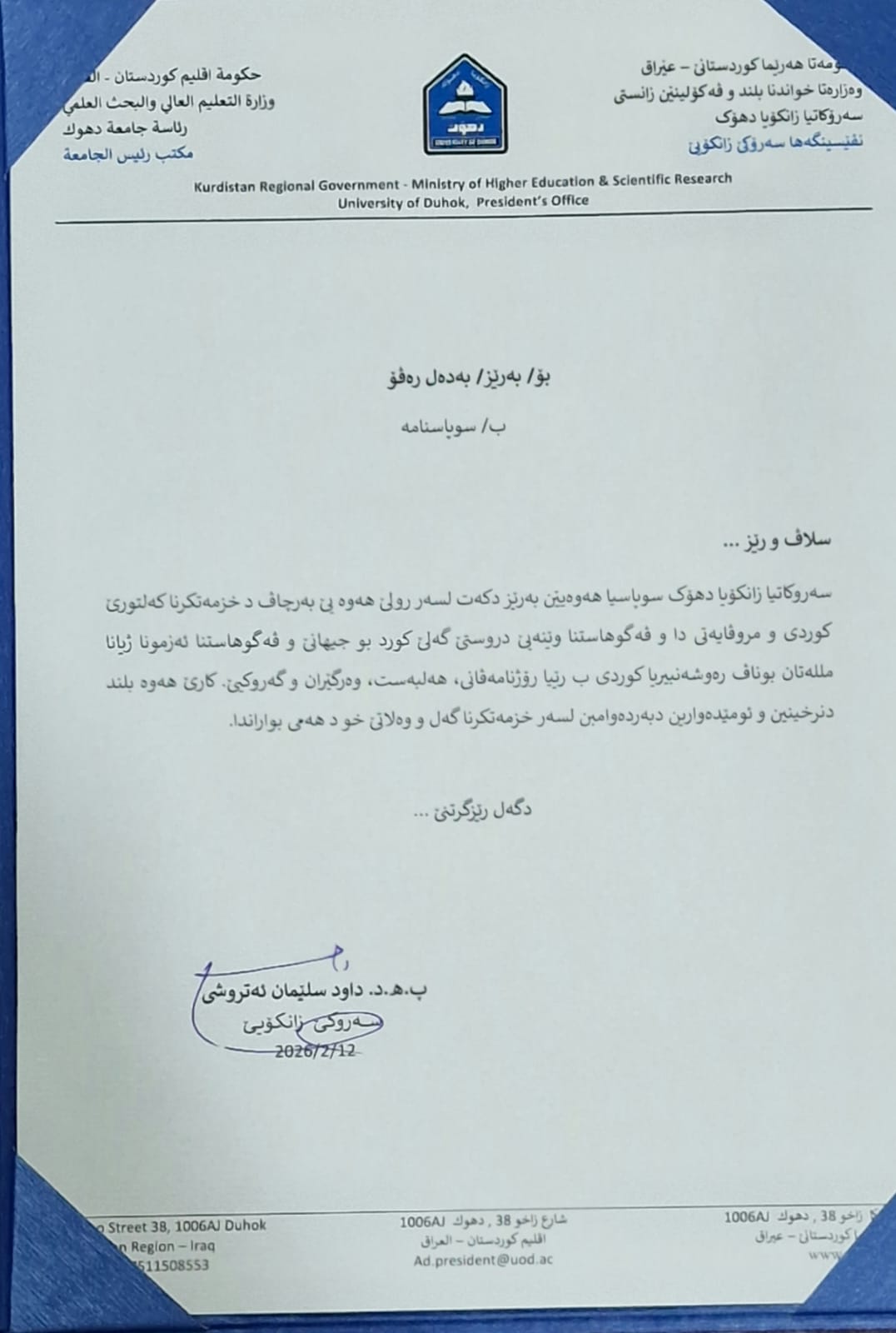 وقال إعلام جامعة دهوك في بيان ورد نسخة حصرية منه للمسرى: ان المراسم جرت بحضور الأستاذ الدكتور داود سليمان الأتروشي، رئيس جامعة دهوك، والدكتور نبز إبراهيم محمد، مساعد رئيس الجامعة، والدكتور أبو عبيدة عبد الله ذياب، عميد كلية اللغات، إلى جانب نخبة من أعضاء الهيئة التدريسية وعدد من المهتمين بالشأن الثقافي والأكاديمي.