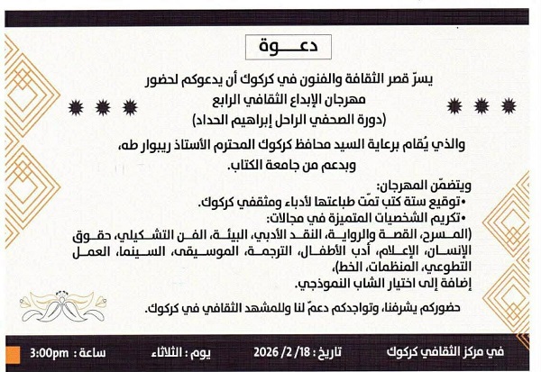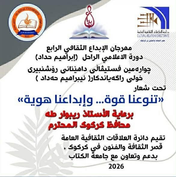 يقيم قصر الثقافة والفنون في كركوك مهرجان الإبداع الثقافي الربع ،برعاية المحافظ ريبوار طه، بدعم من جامعة الكتاب.