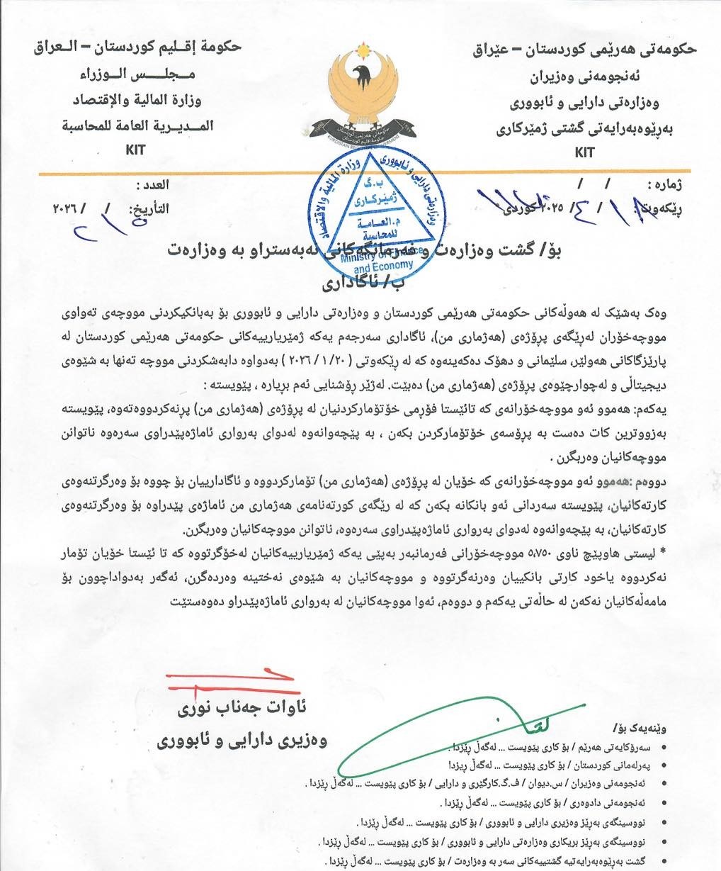 وبحسب كتاب موقّع من قبل وزير المالية آوات جناب نوري فقد تم إبلاغ جميع الموظفين وأصحاب الرواتب في محافظات أربيل والسليمانية ودهوك، بأنه بعد تاريخ 20-1-2026 سيتم توزيع الرواتب حصريا عبر مشروع “حسابي”.