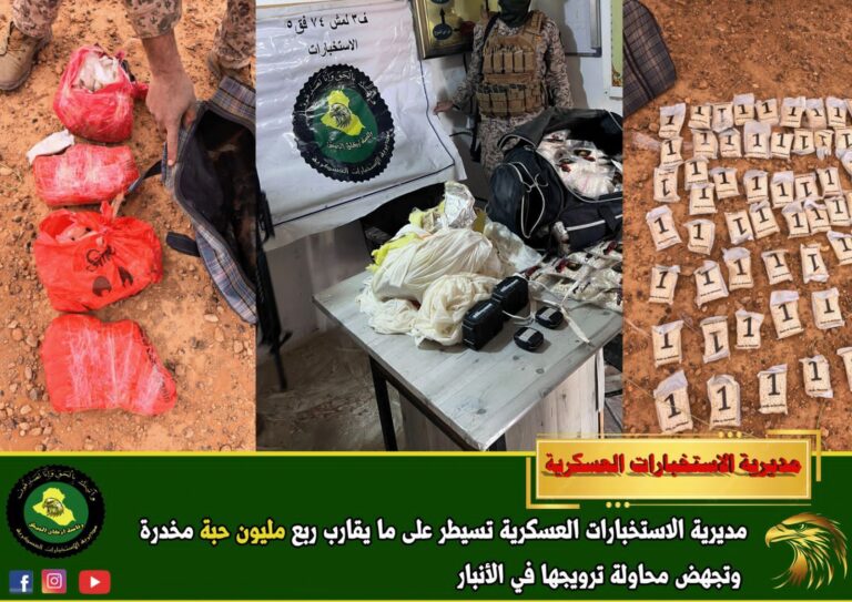 وقالت المديرية في بيان تابعه المسرى ، ان مفارز مديرية الاستخبارات العسكرية في قسم الاستخبارات والأمن لفرقة المشاة الخامسة و استنادًا إلى معلومات استخبارية دقيقة وجهد ميداني متواصل بالتنسيق مع شعبة مخدرات الرطبة تمكنت من إحكام السيطرة على ما يقارب ربع مليون حبة مخدرة من نوع (كبتاجون) كانت معدة للتهريب عن طريق بالونات هوائية مزودة بجهاز GPS في صحراء الأنبار واجهاض ترويجها في المحافظة.