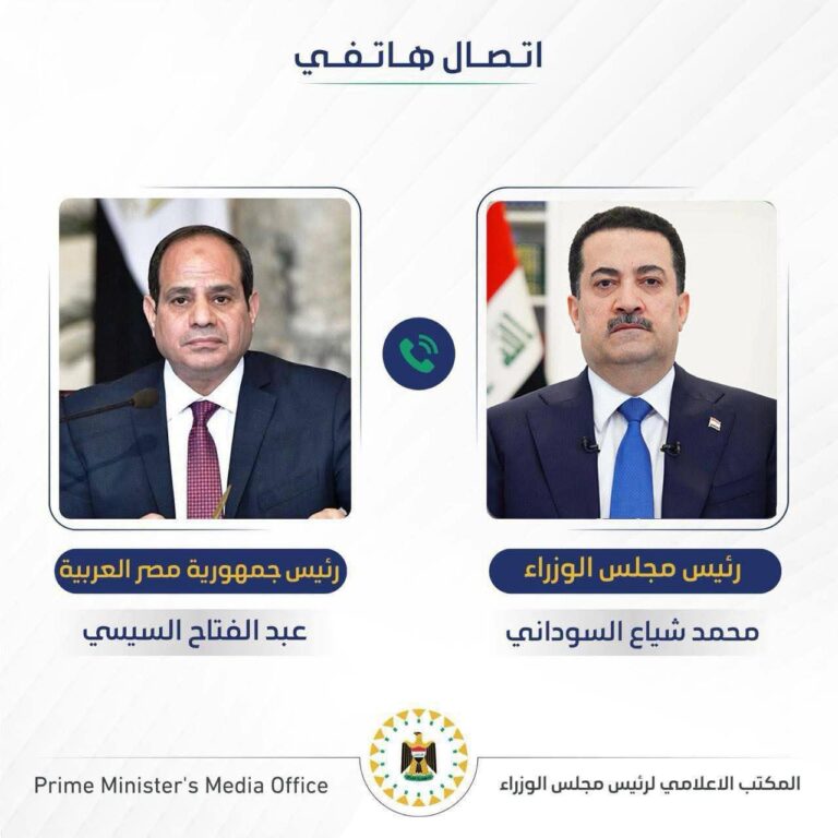بحث رئيس مجلس الوزراء محمد شياع السوداني، في اتصال هاتفي اليوم السبت، مع رئيس جمهورية مصر العربية عبد الفتاح السيسي، تطورات الأوضاع الأمنية الراهنة، والتصعيد الخطير الذي يهدد المنطقة برمتها.