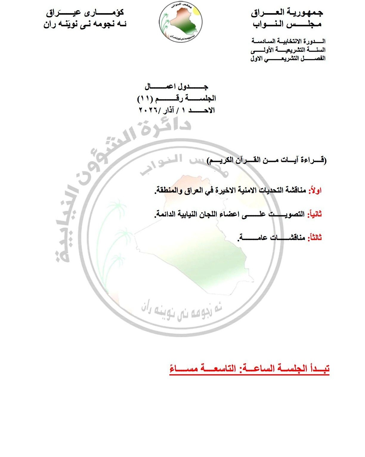 يعقد مجلس النواب، اليوم الأحد، جلسته الاعتيادية رقم 11 لمناقشة 3 فقرات مدرجة على جدول أعماله.