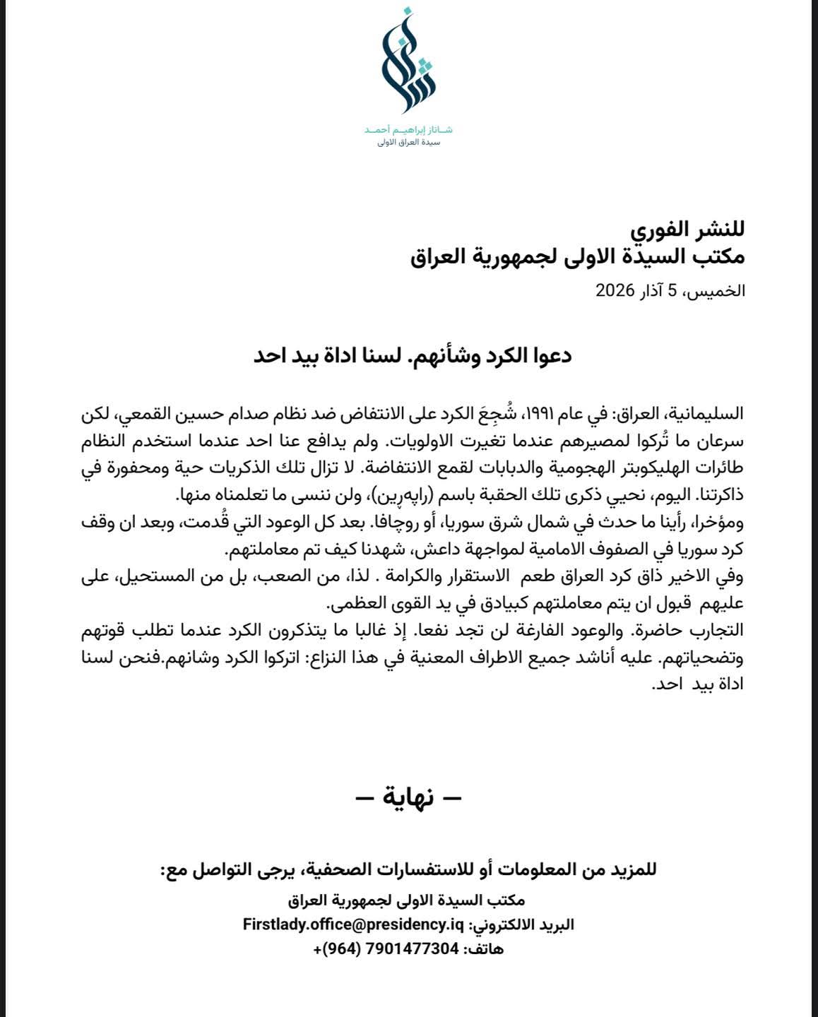 السيدة الأولى: دعوا الكورد وشأنهم، لسنا أداة بيد أحد