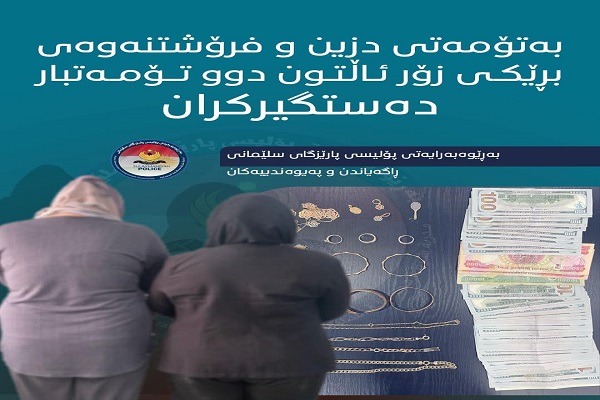 أعلنت قيادة شرطة محافظة السليمانية، اليوم الثلاثاء، عن تمكن مفارز مكافحة الإجرام من القبض على متهمين اثنين بسرقة مصوغات ذهبية من منزل مواطن في المدينة.