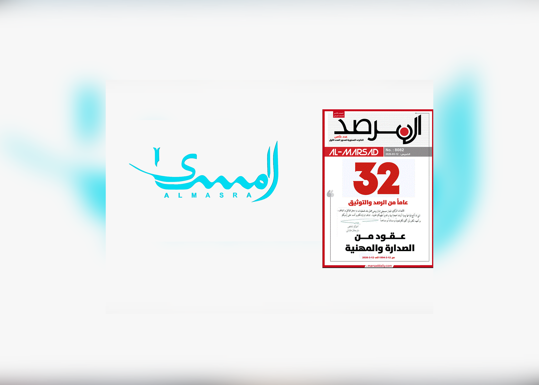 تتقدم أسرة قناة المسرى بأحر التهاني لمجلة المرصد التابعة لمكتب الإعلام والتوعية للاتحاد الوطني الكوردستاني بمناسبة مرور 32 عامًا على تأسيسها وتهنئكم على هذا الإنجاز الكبير وتثمن جهودكم المتميزة في تقديم إعلام رصين وهادف، وترجو لكم دوام التوفيق والنجاح في مسيرتكم الإعلامية.
