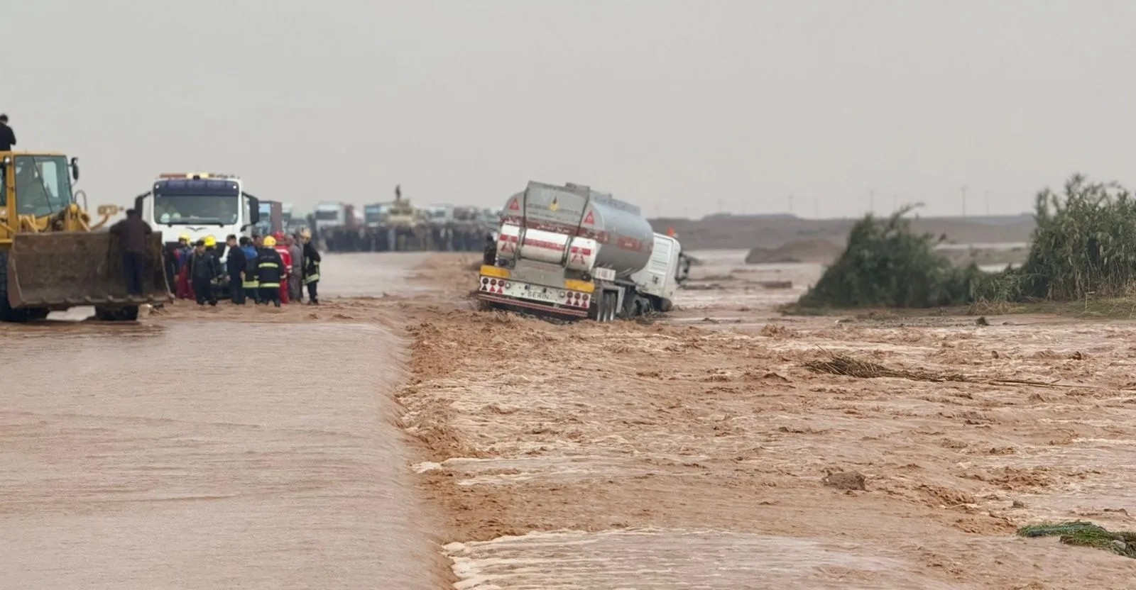 وأضاف، أن عشرات الشاحنات توقفت على جانبي الطريق بانتظار تحسن الوضع، وسط مخاوف من استمرار ارتفاع مناسيب المياه في حال تواصل تدفق السيول من المناطق المرتفعة.