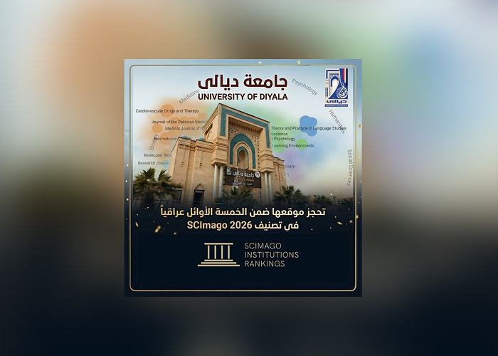تمكنت جامعة ديالى من تحقيق إنجاز علمي متميز بدخولها قائمة أفضل خمس جامعات عراقية وفق تصنيف SIR SCImago لعام 2026، إذ جاءت في المرتبة الخامسة عراقياً من أصل (83) جامعة مدرجة ضمن التصنيف، فيما حلت في المرتبة (6242) عالمياً من أصل (10827) جامعة، في مؤشر يعكس تصاعد مكانتها الأكاديمية والبحثية على المستويين المحلي والدولي.