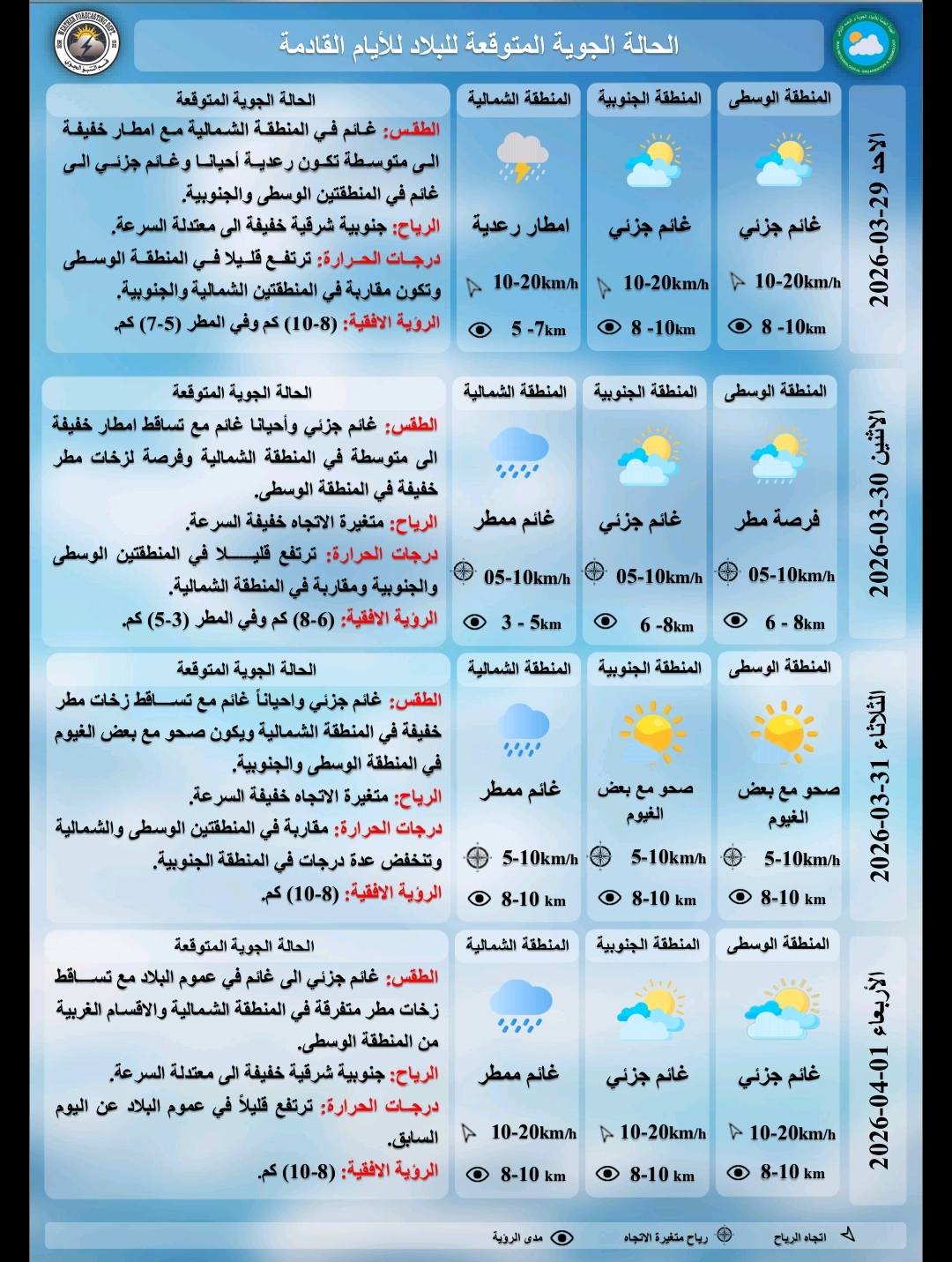 توقعت هيئة الأنواء الجوية السبت 28 , آذار 2026 طقسا غائما وتساقطا للأمطار، وتباينا بدرجات الحرارة خلال الأيام المقبلة.