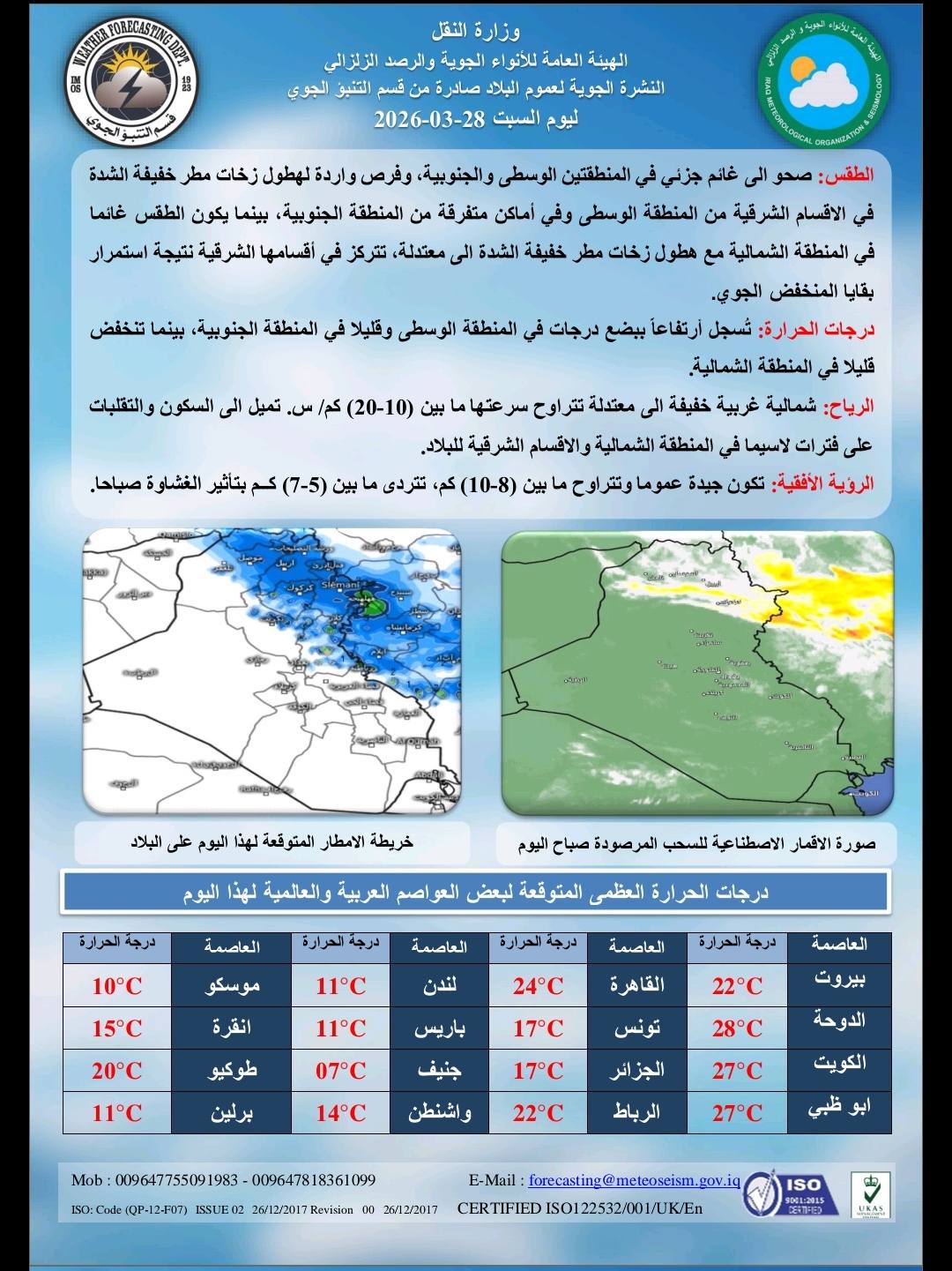 توقعت هيئة الأنواء الجوية السبت 28 , آذار 2026 طقسا غائما وتساقطا للأمطار، وتباينا بدرجات الحرارة خلال الأيام المقبلة.