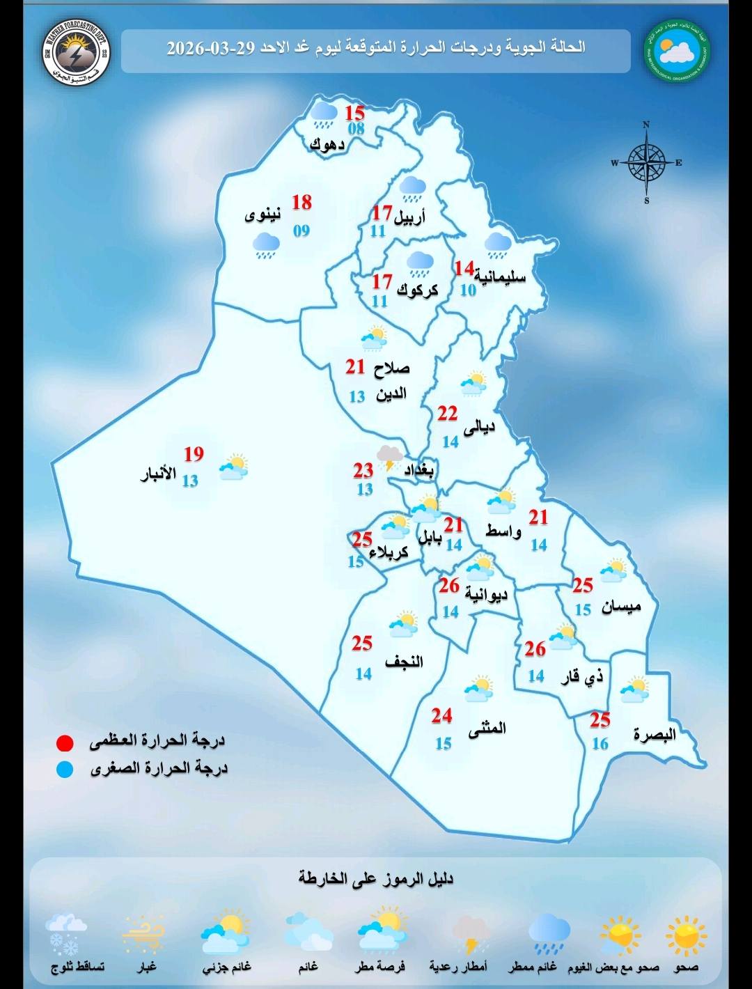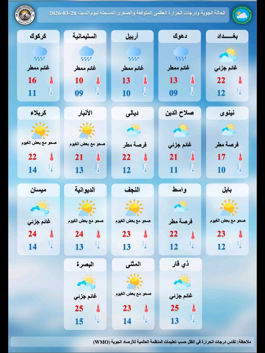 وكانت درجة الحرارة الصغرى في بغداد هذا اليوم 12 مئوية والعظمى المتوقعة 22 مئوية.أضافت:”أن طقس يوم الإثنين سيكون غائما جزئيا إلى غائم في عموم البلاد، مع تساقط أمطار في المناطق الوسطى والشمالية، والرياح متغيرة خفيفة إلى معتدلة السرعة، ودرجات الحرارة ترتفع قليلا عن اليوم السابق في المناطق الوسطى والجنوبية ومقاربة لليوم السابق في المناطق الشمالية”.
