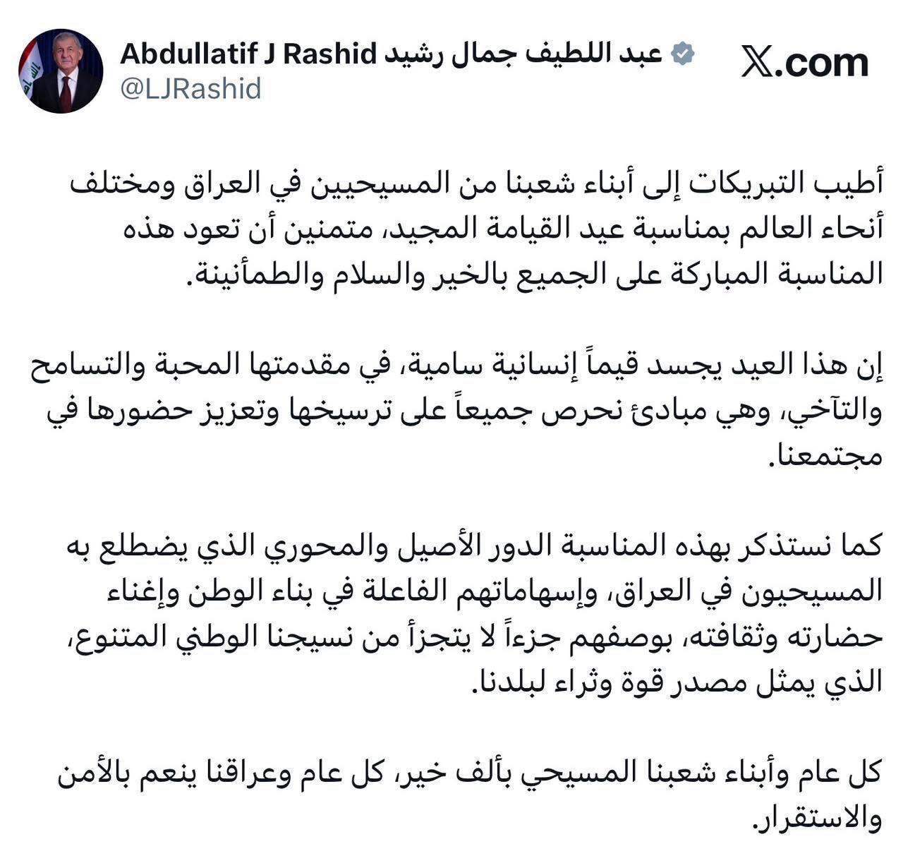 أطيب التبريكات إلى أبناء شعبنا من المسيحيين في العراق ومختلف أنحاء العالم بمناسبة عيد القيامة المجيد، متمنين أن تعود هذه المناسبة المباركة على الجميع بالخير والسلام والطمأنينة.