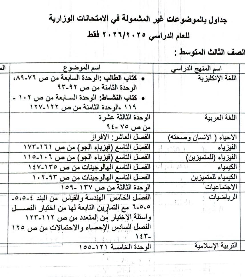 أعلن المكتب الإعلامي في وزارة التربية ، اليوم السبت ، عن جداول تتضمن تعليق عدد من الموضوعات الدراسية للعام الدراسي الحالي فقط.