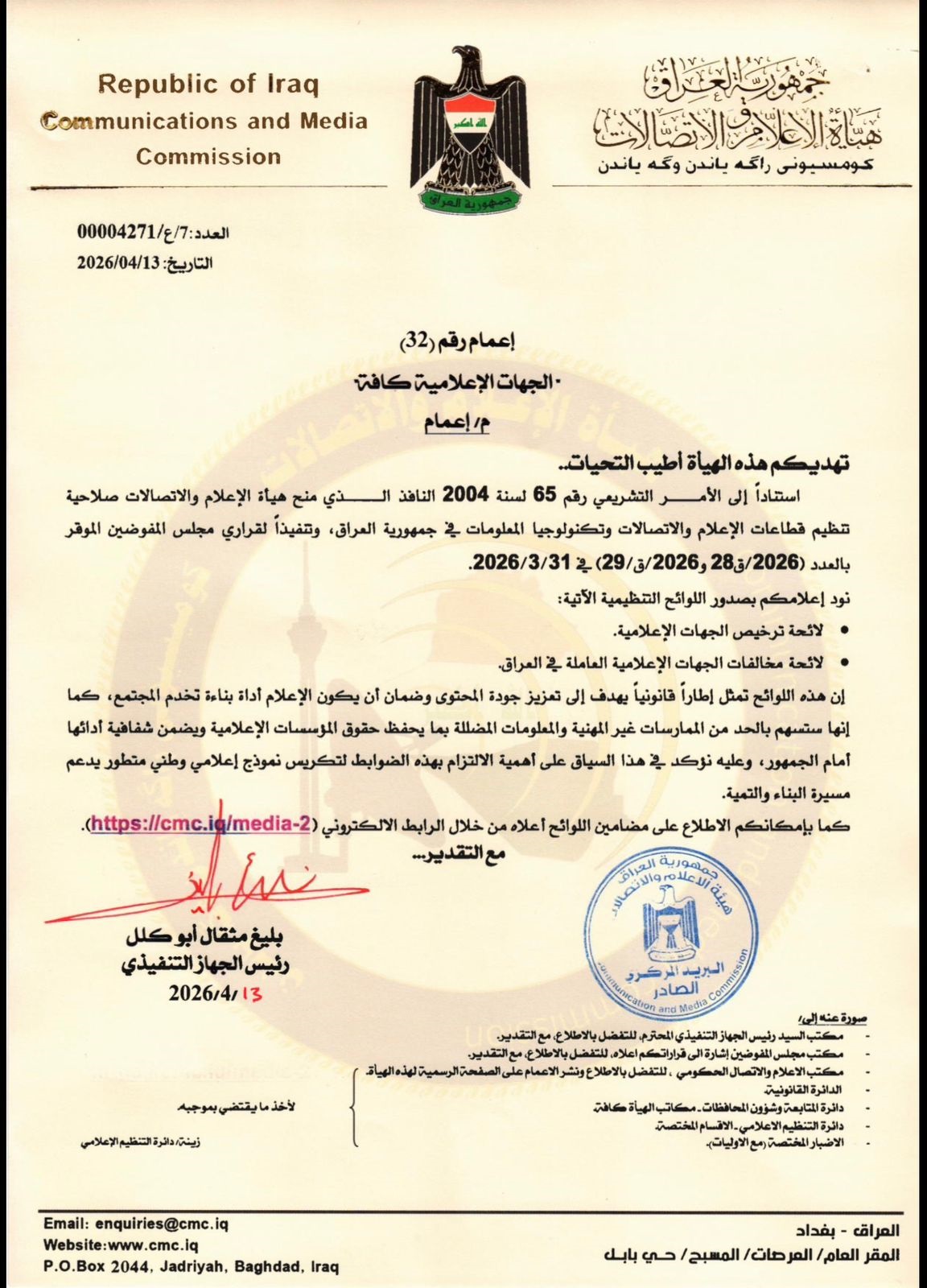 شاركها فيسبوك تويتر لينكدإن بينتيريست البريد الإلكتروني أصدرت هيأة الإعلام والاتصالات، تعليمات تنظيمية جديدة للمواقع والصفحات الإعلامية، أكدت في ( وثيقة ) على وسائل الإعلام الالتزام بها.