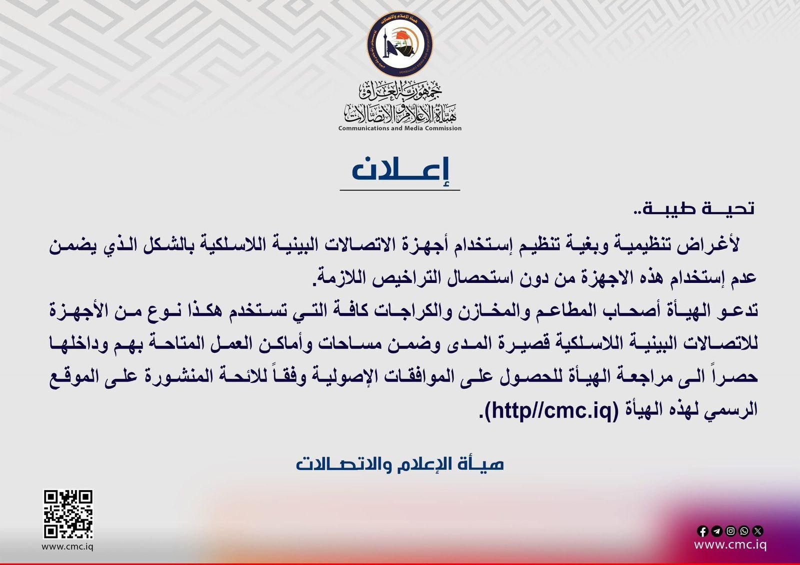 تدعو الهيأة أصحاب المطاعم والمخازن والكراجات كافة التي تستخدم هكذا نوع من الأجهزة للاتصالات البينية اللاسلكية قصيرة المدى وضمن مساحات وأماكن العمل المتاحة بهم وداخلها حصراً الى مراجعة الهيأة للحصول على الموافقات الإصولية وفقاً للائحة المنشورة على الموقع الرسمي لهذه الهيأة (http//cmc.iq).