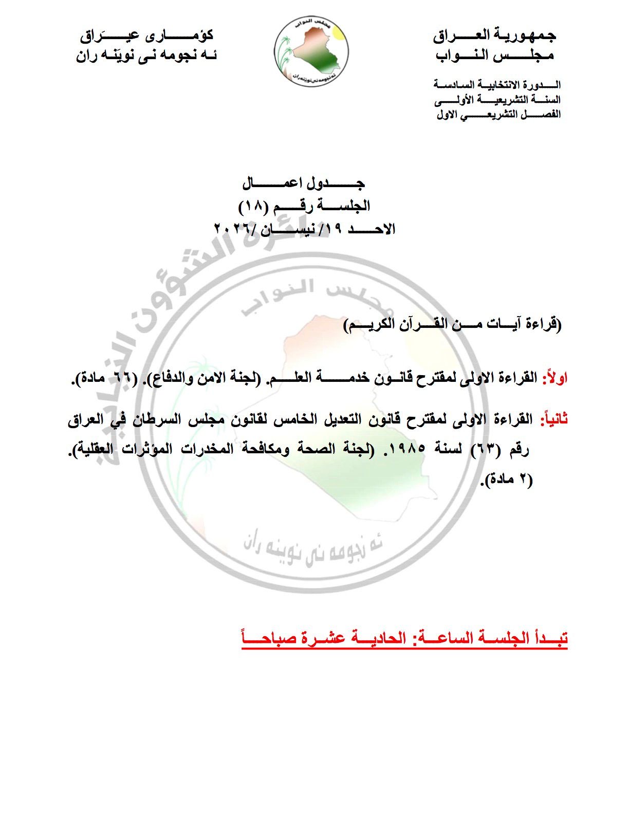 وتبدأ جلسة الأحد 19 نيسان 2026 بالقراءة الأولى لمقترح قانون خدمة العلم المقدم من لجنة الأمن والدفاع، إلى جانب التعديل الخامس لقانون مجلس السرطان رقم 3 لسنة 1985 المقدم من لجنة الصحة ومكافحة المخدرات والمؤثرات العقلية.الاثنين: المياه والتحكيم