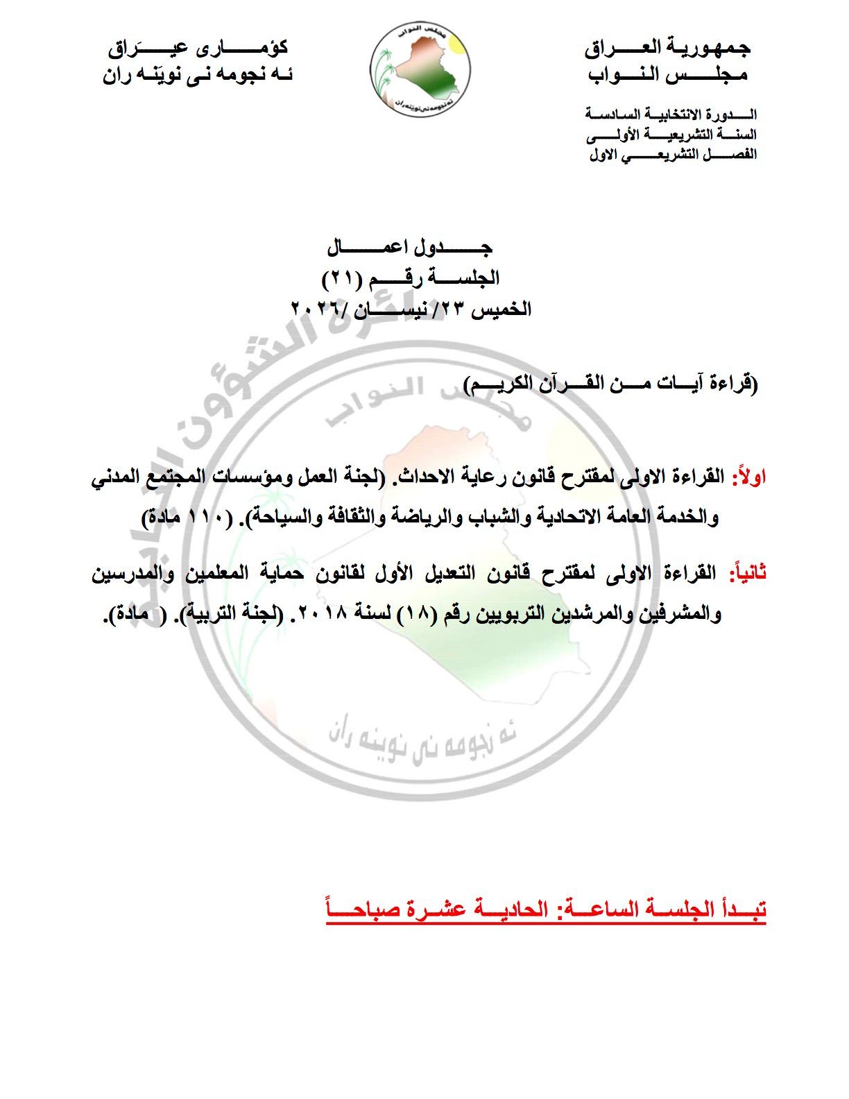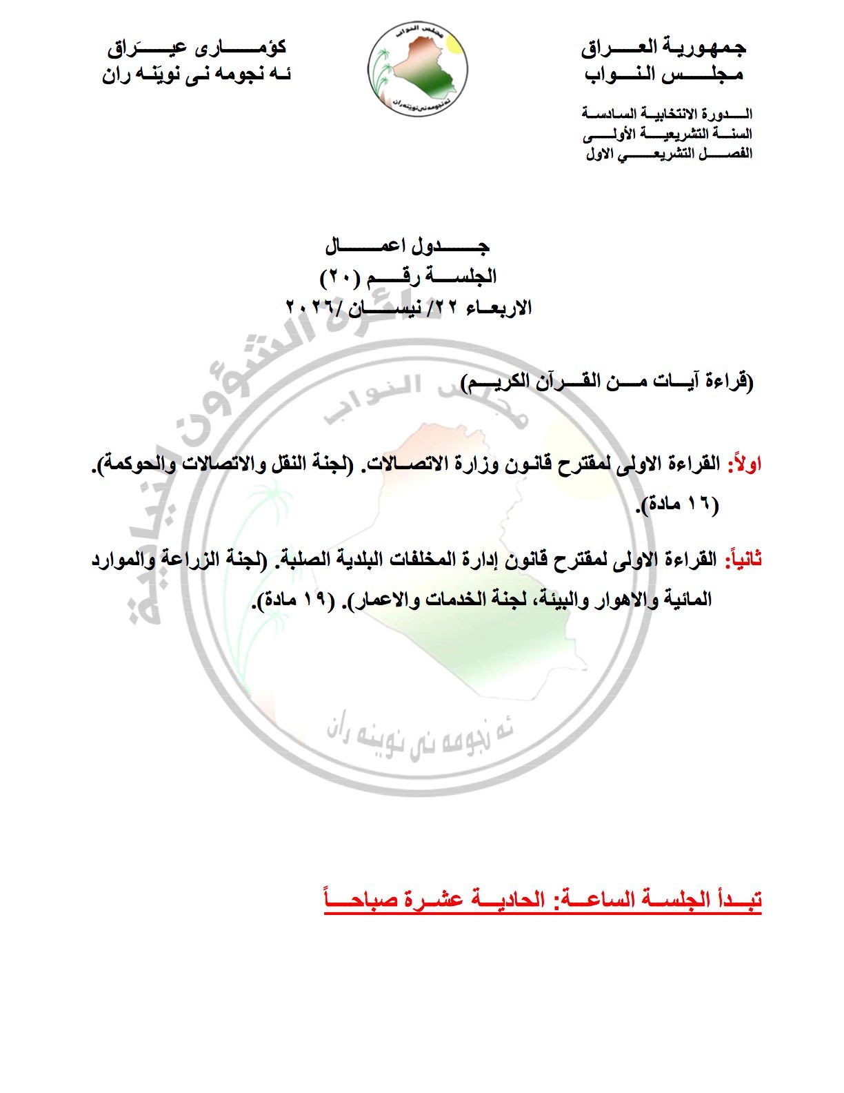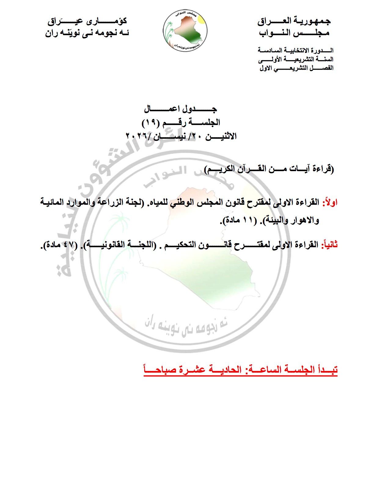 وفي جلسة الاثنين 20 نيسان، يطرح المجلس القراءة الأولى لمقترح قانون المجلس الوطني للمياه المقدم من لجنة الزراعة والمياه والأهوار والبيئة، ومقترح قانون التحكيم المقدم من اللجنة القانونية.الأربعاء: الاتصالات والمخلفات الصلبة.