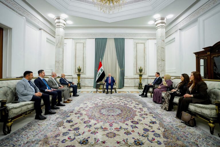 استقبل رئيس الجمهورية نزار ئاميدي، اليوم الأحد 19 نيسان 2026، في قصر بغداد، وفداً من رؤساء الكتل الكردستانية، ضم: رئيس كتلة تيار الموقف الوطني ريبوار كريم، ورئيس كتلة جماعة العدل الكردستانية أحمد حاجي رشيد، وعن كتلة الاتحاد الإسلامي عمر محمد وعمر كوجر ، الذين قدموا له التهاني والتبريكات بمناسبة تسنمه منصب رئاسة الجمهورية، متمنين له التوفيق والسداد في أداء مهامه.