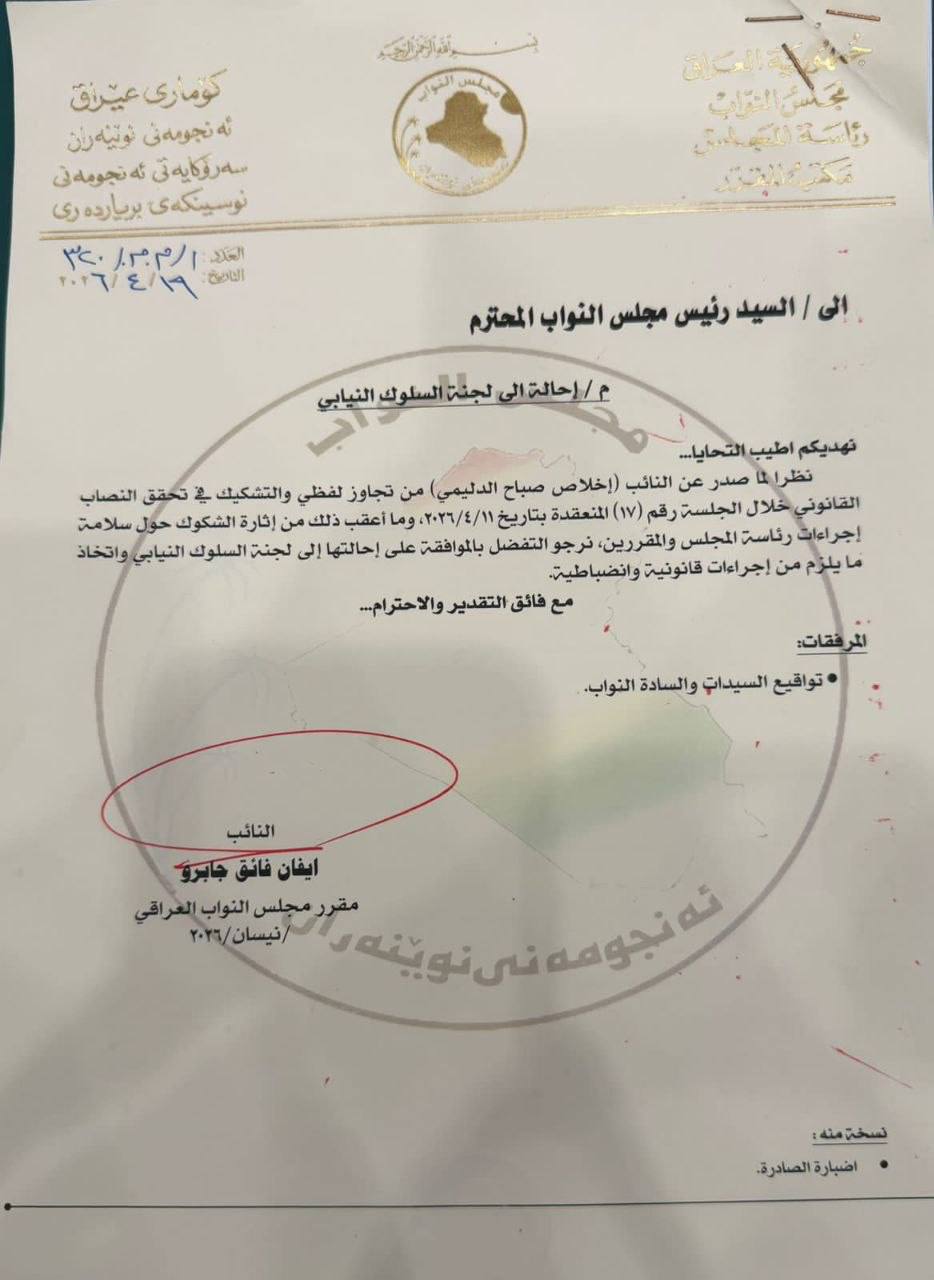 وجهت مقررة مجلس النواب إيفان فائق جابرو طلباً رسمياً إلى رئاسة المجلس لإحالة النائبة إخلاص الدليمي عن الحزب الديمقراطي الكوردستاني إلى لجنة السلوك النيابي، على خلفية ما وصفته بتجاوز لفظي وتشكيك في تحقق النصاب القانوني خلال الجلسة رقم 17.