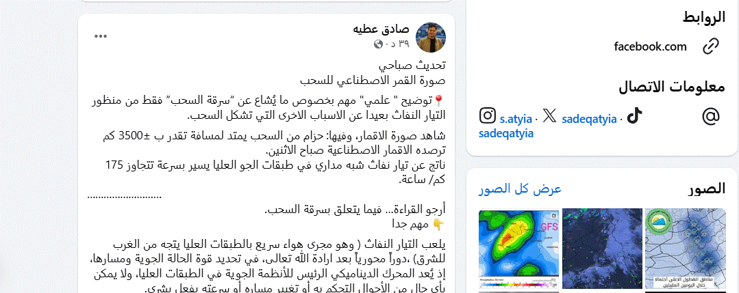 وأوضح عطية في منشور أن التيار النفاث يُعد المحرك الديناميكي الرئيس للأنظمة الجوية، وتتحرك رياحه بسرعات هائلة تجعل التحكم بمساره أو سرعته بفعل بشري أمراً مستحيلاً.