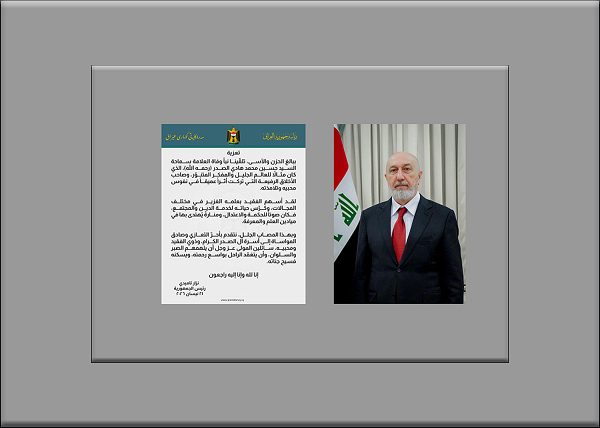 قدم رئيس الجمهورية نزار آميدي، اليوم الثلاثاء، تعازيه بوفاة السيد حسين الصدر،وقال في بيان : “ببالغ الحزن والأسى، تلقّينا نبأ وفاة العلامة سماحة السيد حسين محمد هادي الصدر (رحمه الله)، الذي كان مثالاً للعالم الجليل والمفكر المتنوّر، وصاحب الأخلاق الرفيعة التي تركت أثراً عميقاً في نفوس محبيه وتلامذته”.