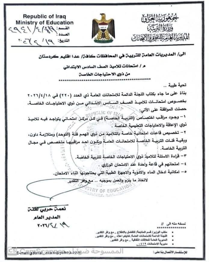 وأوضح المكتب في بيان تابعه المسرى ، “أن الإجراءات تضمنت تخصيص مراقب من ذوي الاختصاص في التربية الخاصة داخل المراكز الامتحانية التي تضم هذه الفئة، فضلاً عن توفير قاعات امتحانية مستقلة لطلبة التوحد ومتلازمة داون وبقية فئات التربية الخاصة، وإسناد الإشراف فيها إلى ملاكات مختصة،مع إمكانية قراءة الأسئلة عند الحاجة، والسماح بإدخال الماء والأدوية والأجهزة الطبية خلال فترة الامتحانات”.