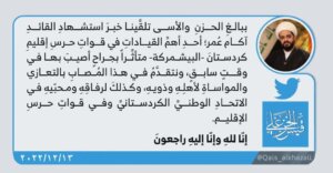 وأضاف “نتقدم في هذا المصاب بالتعازي والمواساة لأهله وذويه، وكذلك لرفاقه ومحبيه في الاتحاد الوطني الكوردستاني، وفي قوات حرس الإقليم”.